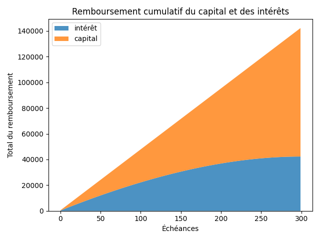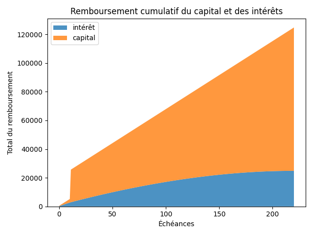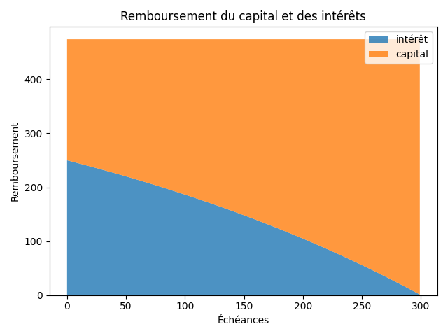 - On observe qu'il faut presque attendre 2 ans (échéance 24) pour payer autant en capital qu'en intérêts.