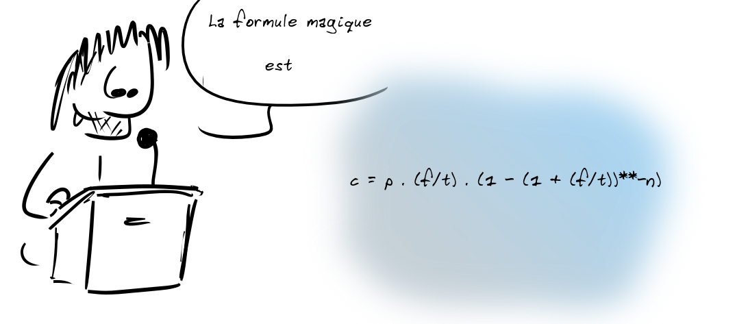 Voilà pourquoi j'ai commencé à chercher, trouver la formule des banques, apprendre leur jargon et enfin mettre tout cela dans un script qui m'explique à quel point on donne plein de sous aux banques sans comprendre l'origine des chiffres.